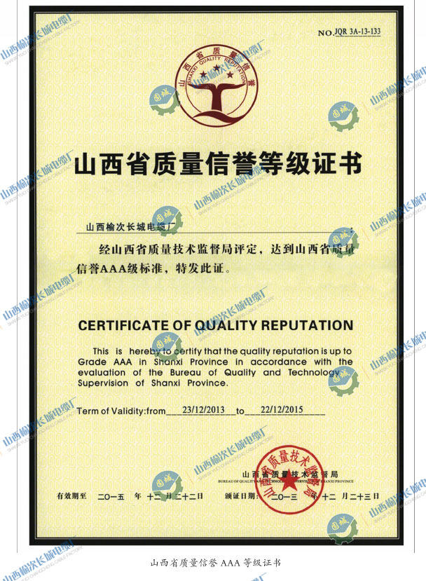 山西省質量信譽AAA等級證書